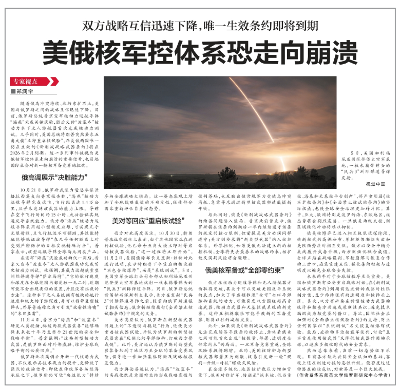郑润宇:双方战略互信迅速下降,唯一生效条约即将到期 美俄核军控体系恐走向崩溃
