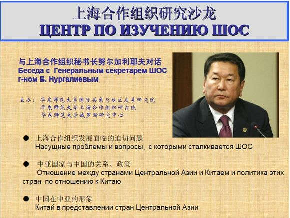 应国家开发银行—华东师范大学上海合作组织研究院、国际关系与地区发展研究院、俄罗斯研究中心的邀请,2009年9月23日上海合作组织秘书长努尔加利耶夫来访华东师大,就上海合作组织的发展、中国与中亚国家的关系等问题进行了讲演,并与师生们进行了座谈。本次学术活动同时还邀请了上海社科院等单位的俄罗斯、欧亚问题专家。我院院长冯绍雷教授、副院长贝文力副教授、俄罗斯研究中心副主任杨成副教授等领导、老师及我院部分学生代表参加了座谈。