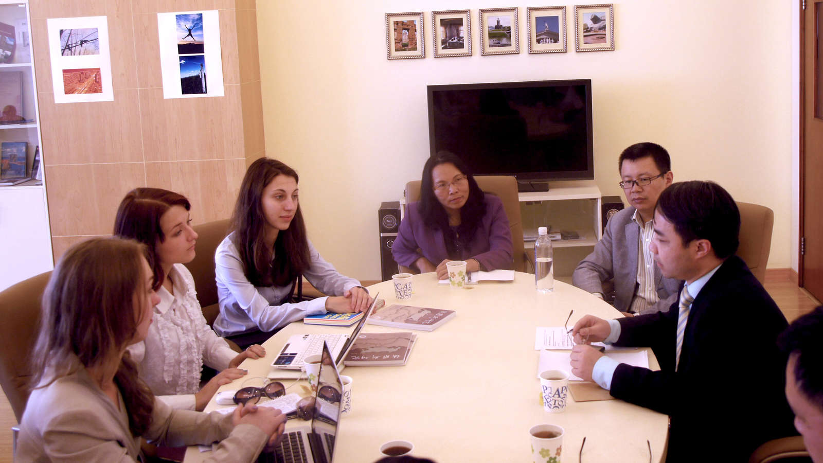 2012年10月23日下午,上海市委党校三名俄罗斯交流生访问华东师大俄罗斯研究中心,俄罗斯研究中心贝文力老师、杨成老师、王海燕老师、李承红老师、姜睿老师、郑润宇老师等对俄罗斯三名交流生的到访表示热烈欢迎,在愉快的气氛中,老师们仔细认真的回答了交流生们提出的关于中俄能源合作、上海合作组织、波罗的海明珠项目等问题,并且向他们提供相关研究资料和资料收集方式。访谈结束后,老师们和三名交流生亲切合影。