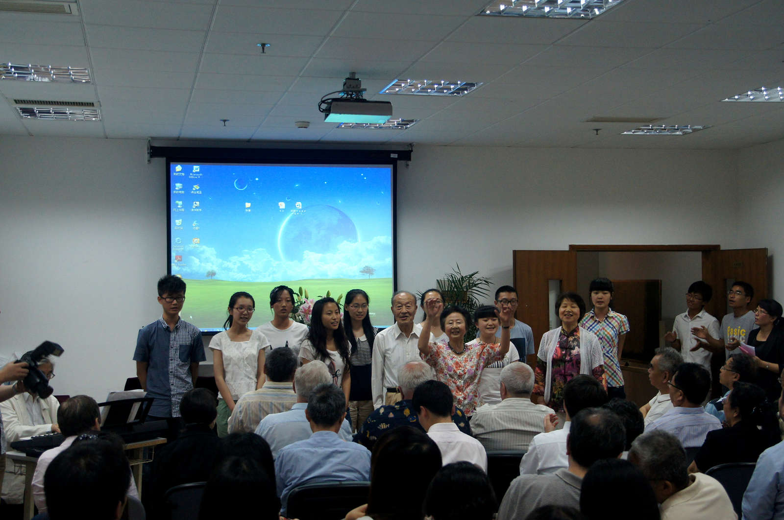 我校老教授合唱团,我校、上海外国语大学和复旦大学的学生以及上海俄语爱好者俱乐部成员还演唱了《灯光》《小路》和《喀秋莎》等苏联卫国战争时期的歌曲,朗诵了苏联著名诗人西蒙诺夫的名作《等着我吧!》,将活动推向高潮。