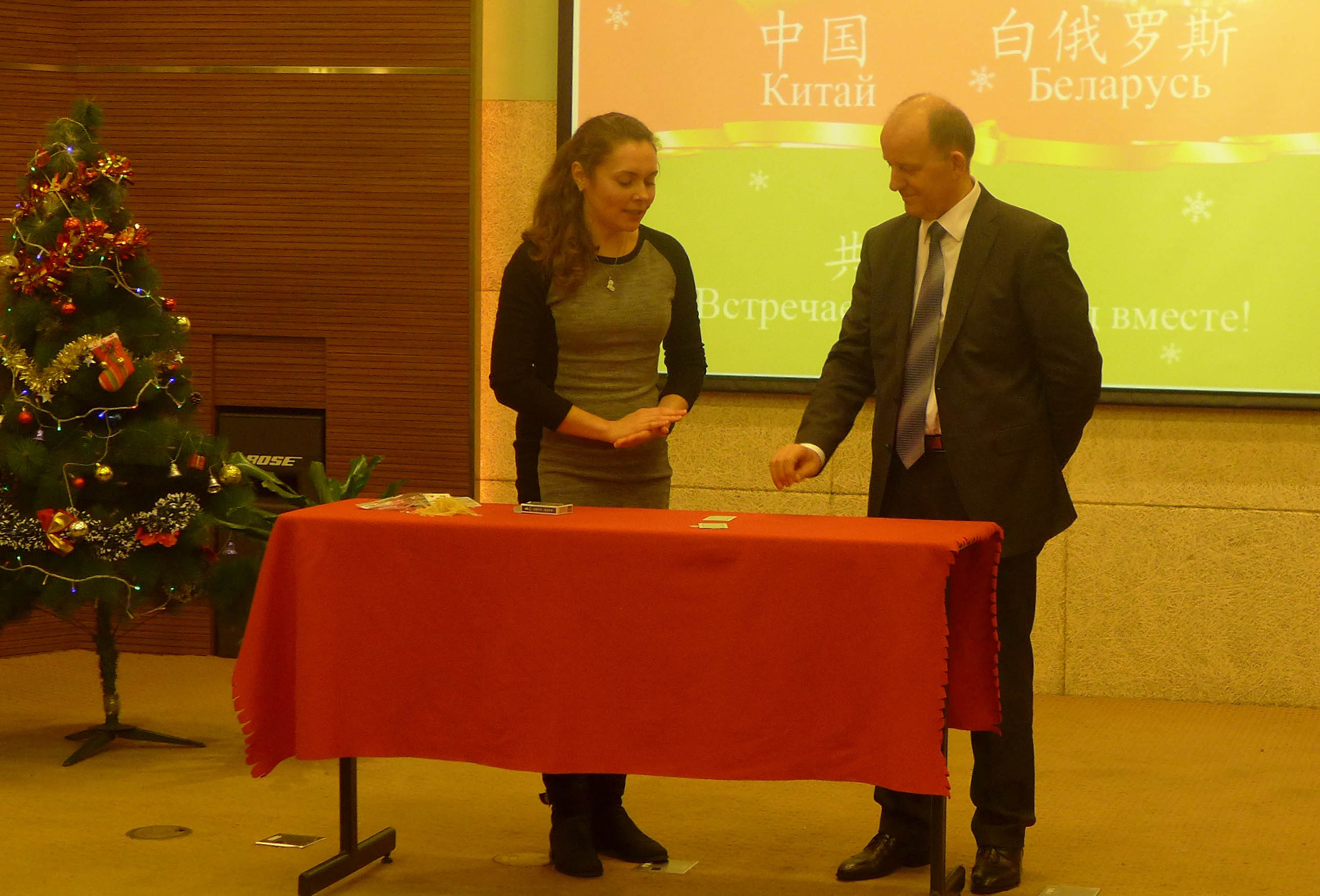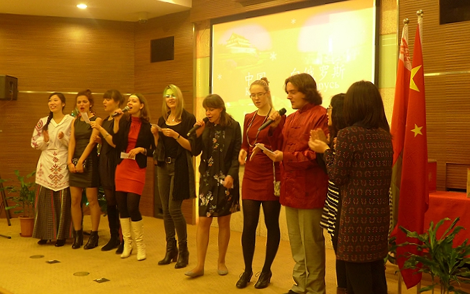 晚会上,中国学生用白语朗诵白俄罗斯诗人的作品,白俄罗斯留学生用汉语演唱中国新年歌曲,表达了相互间的友谊和增强彼此了解的愿望。晚会穿插了一系列互动环节。而全场来宾在欢快的乐曲声中共跳白俄罗斯传统节日舞蹈,更是把晚会的气氛推向了高潮。