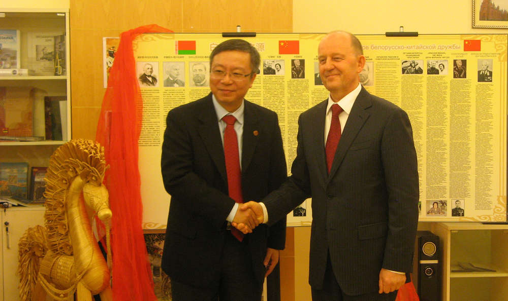 在热烈的掌声中,任友群和马采利共同为“中白友谊之源”展览揭幕。展览介绍了不同历史时期中白两国人民间的真诚友谊和互相间的支持与帮助。